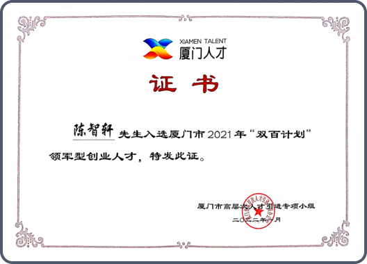 厦门双百计划领军人才证书